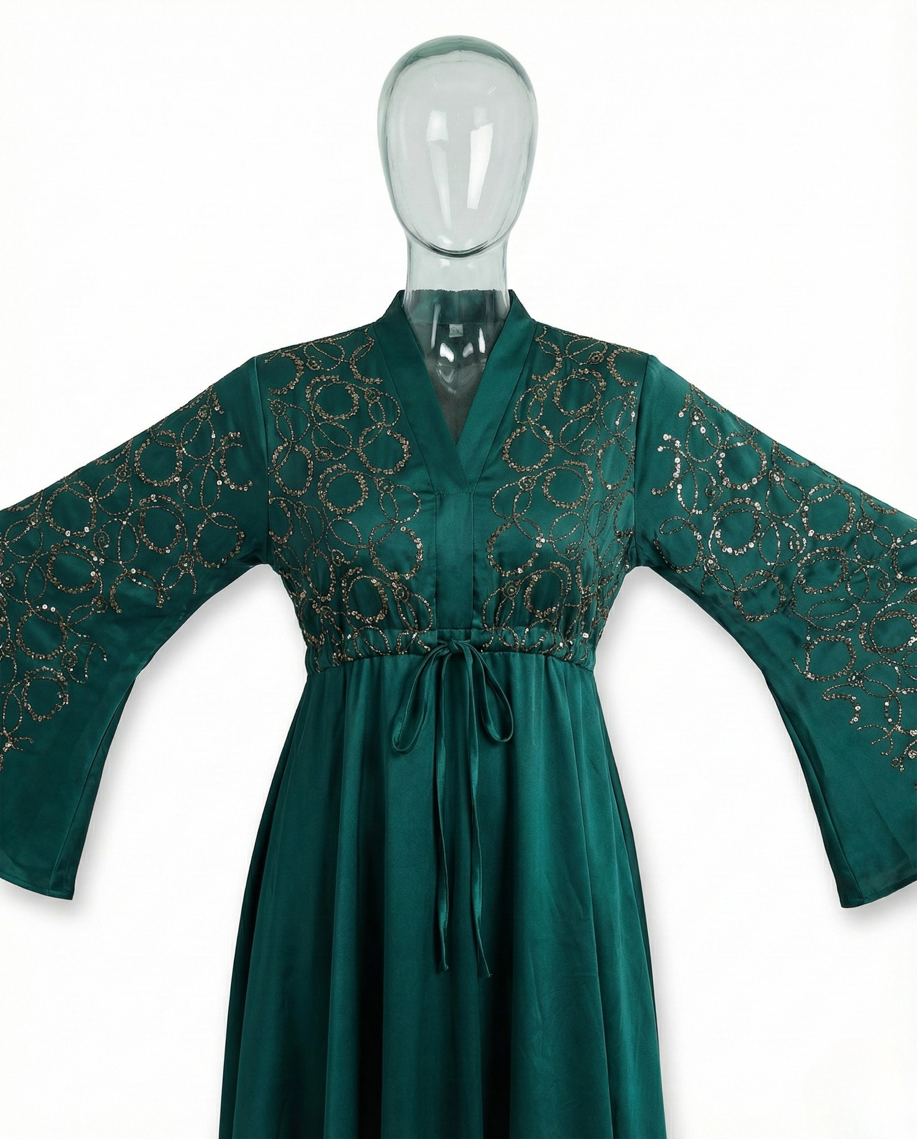 Chic et lumineuse, cette abaya style kimono en vert émeraude se distingue par ses motifs perlés raffinés qui captent subtilement la lumière. Sa coupe fluide avec col en V allonge la silhouette, tandis que la ceinture à nouer permet d’ajuster la taille selon le rendu souhaité, cintré ou plus ample. Une pièce élégante, parfaite pour les occasions, les soirées ou un look modest fashion premium.