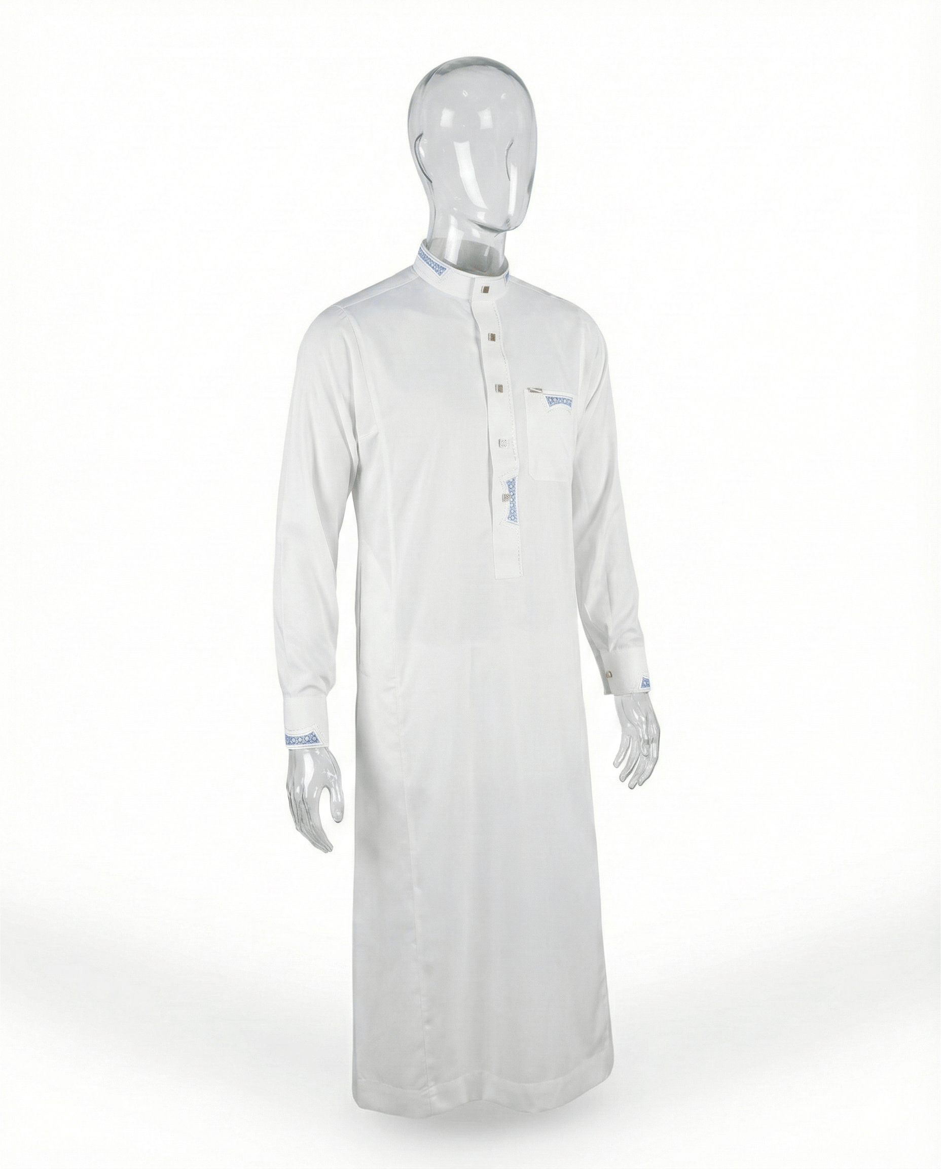 Ce qamis blanc revisite l’essentiel avec une touche raffinée. Son col officier net et ses finitions contrastées bleu céleste apportent du caractère tout en gardant un style propre et minimal. Les détails graphiques aux poignets, à la patte et sur la poche poitrine créent un équilibre élégant entre sobriété et distinction. Parfait pour les occasions comme pour le quotidien, quand tu veux un look impeccable sans effort.